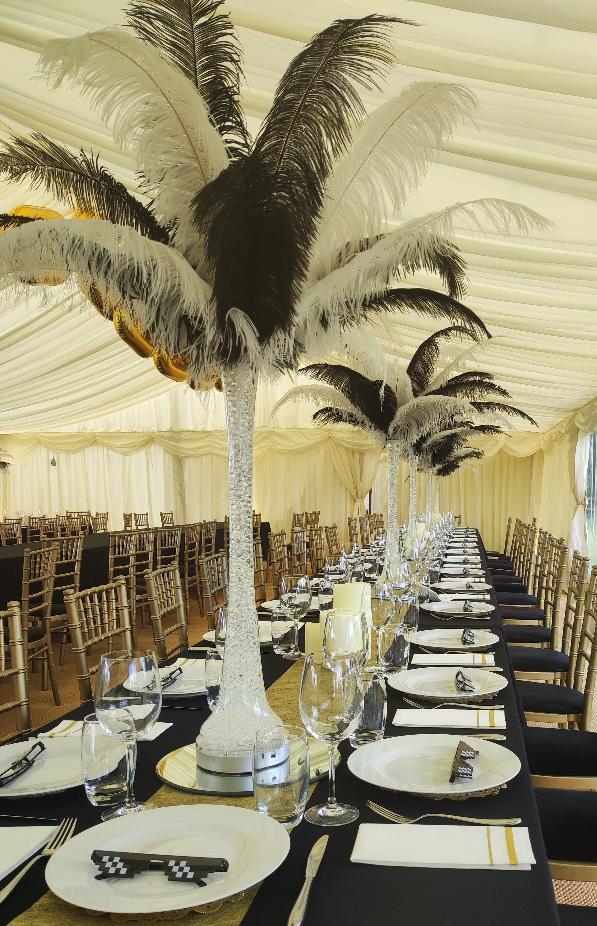 Ostrich feather centrepieces seen here for a Great Gatsby Marquee event in Steeple Claydon