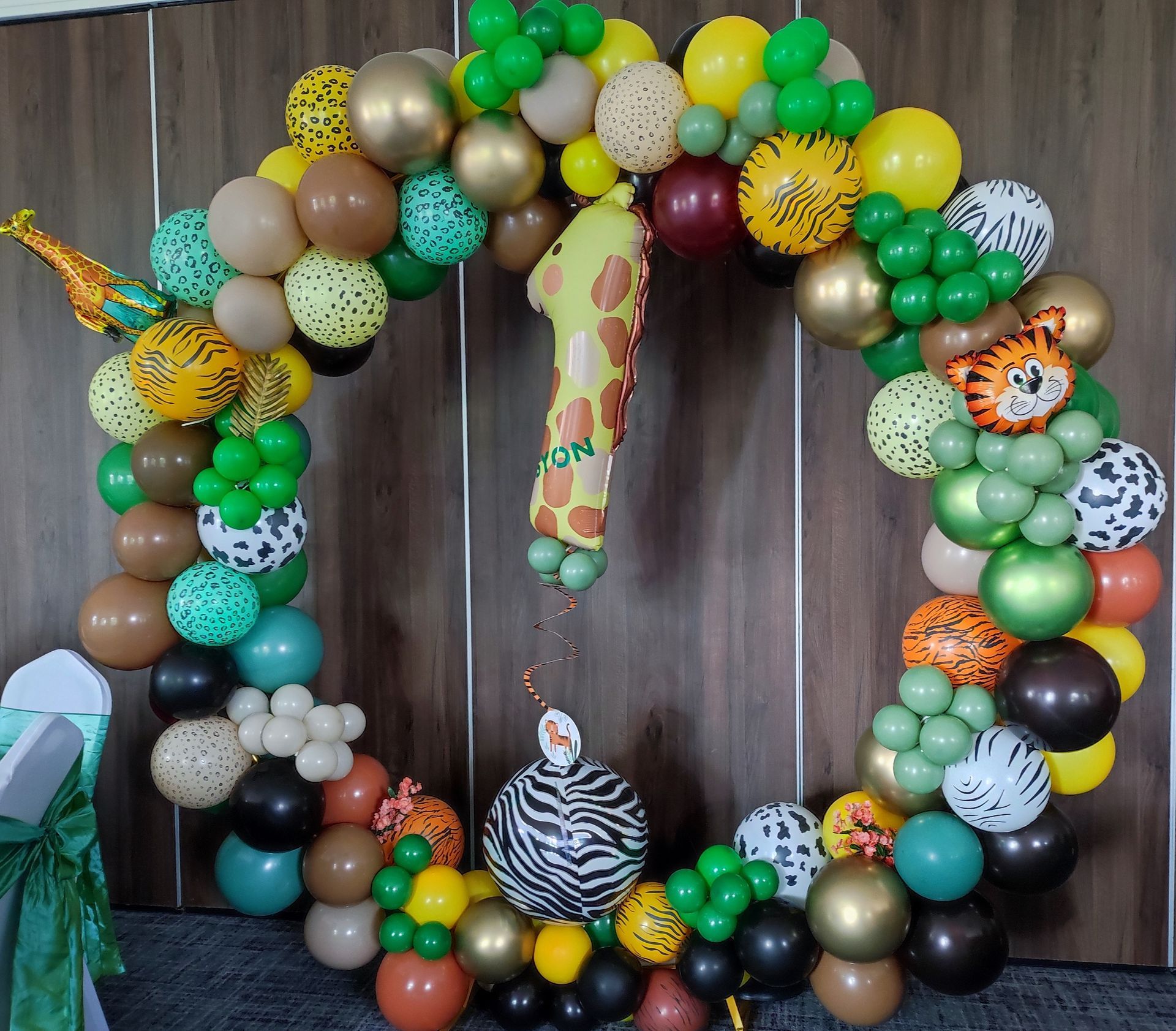 Jungle themed balloon hoop for a 1st birthday. Woughton Hotel, Milton Keynes
